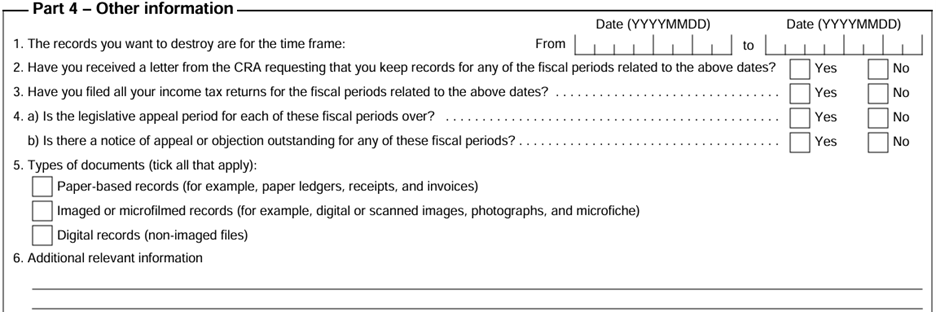 Pro Tax Tip: Before granting a request for permission to destroy records, CRA will require that all tax returns for the period in question must be filed and there cannot be any outstanding appeals.