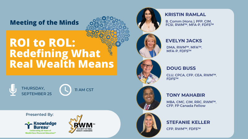 Financial professionals and thought leaders are gathering for a compelling Meeting of the Minds session tomorrow: “ROI or ROL: Redefining What Real Wealth Means to You.” This complimentary, one-hour virtual event explores a powerful shift in wealth management — move beyond Return on Investment (ROI) towards Financial Peace of Mind – a Return on Life. It’s about aligning financial strategies with purpose and helping clients achieve true peace of mind.