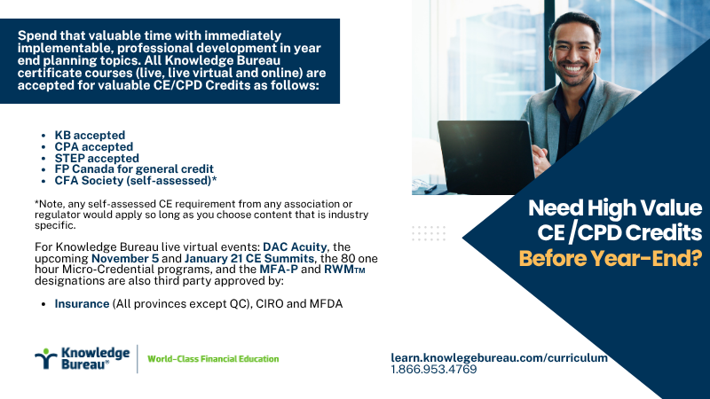 Spend your valuable time with immediately implementable, professional development in year-end planning topics. Did you know that all Knowledge Bureau certificate courses (live, live virtual and online) are accepted for valuable CE/CPD Credits? Details follow. Plus, we have a DMA Designation Program offer, it’s so good – it’s scary!. Check it out:
